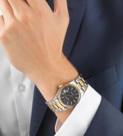 cassa oyster in acciaio con ghiera zigrinata in oro giallo, quadrante nero opaco con indici oro, vetro plastica, movimento a carica automatica cal 1570, bracciale oyster ref. 78363 in acciaio e oro giallo 14kt. con finali ref. 458. Diam. mm 36