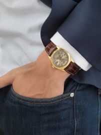 cassa oyster in oro giallo 18 kt con ghiera zigrinata, quadrante grigio con indici applicati, fondello 1803, indicazione giorno della settimana in inglese, vetro plastica, movimento a carica automatica cal. 1556, cinturino in pelle con fibbia Rolex placcata oro. Diam mm 36