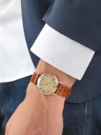 cassa in oro rosa 18kt, anse a goccia, corona non marcata, quadrante numeri arabi applicati, vetro plastica, movimento a carica manuale cal. 453, cinturino in pelle con fibbia originale in oro 18kt non coeva. Diam. mm 34