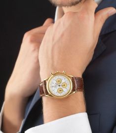 cassa in oro giallo 18kt, fondello a scatto, tasti cronografici a pompa, quadrante bianco con contatori cronografici color oro, vetro minerale, movimento a carica automatica P400, cinturino in pelle con fibbia originale Zenith placcata oro. Orologio corredato di scatola e garanzia originale. Diam. mm 36