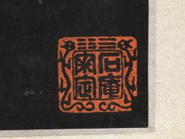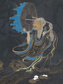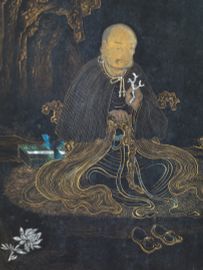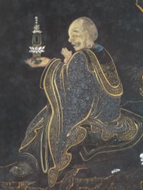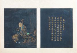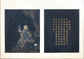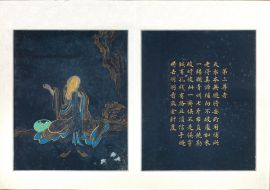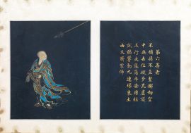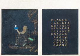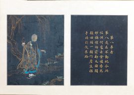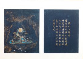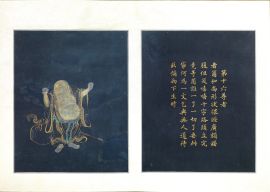 composto da diciotto fogli di carta color indaco con pigmenti d’oro e colore raffigurante i diciotto luohan accompagnato da un testo annotatativo in cinese; cm 21x26 l'uno (18)