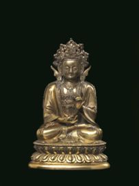 la prima figura in bronzo dorato sino-tibetano raffigurante Vairocana, il Buddha cosmico, l'incarnazione della Legge buddista, con splendore infinito, è proiettata qui nella posizione del loto, seduta nel padmasana, su un piedistallo a base di loto, ornato con una collana formata da tre file di perline, il viso con uno sguardo sereno porta come corona un alto diadema fogliato, la seconda figura in bronzo dorato raffigurante Amitayus seduto su base doppia a fior di loto, veste decorata con delle foglie stilizzate sui bordi, tre fili di perle sul petto e un diadema elaborato sopra la testa; alt. cm 21 e cm 21,7 (2)
