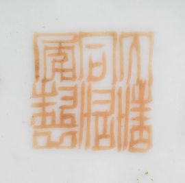 in porcellana policroma di forma circolare, dipinto un saggio e pipistrello entro riserva; alt. cm 27,7
