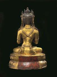 in bronzo dorato raffigurante il buddha Vajradhara seduto in dhyanasana su una base doppia a fior di loto, le braccia incrociate e le mani tengono campana e vajra, le lunghe orecchie portano grande orecchini circolari. La corona e gli ornamenti della veste sono costituiti da foglie; alt. cm 24,8