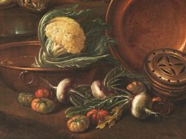 La grande tela è tipica della produzione di Giovanni Domenico ValentinO dove imprescindibile è il ricorso a modelli nordici. Nell’interno di una cucina, dove una figura femminile è intenta a ravvivare il fuoco, si ammucchiano in pittoresco disordine ortaggi, selvaggina, utensili in rame e terracotte, brani di natura morta tratteggiati con intenso realismo.