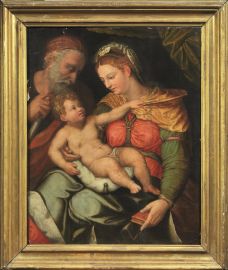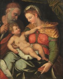 La composizione rielabora una delle numerose varianti sul tema della Sacra Famiglia di Perin del Vaga (Firenze, 1501 – Roma, 1547), prima in numerosi disegni e poi in pittura. Le figure, colte in un atteggiamento affettuoso, dalle forme dilatate che occupano tutto lo spazio disponibile di questa tavola, trovano infatti uno dei possibili modelli nella Sacra Famiglia di Perino conservata presso l’Australian National gallery di Victoria a Melbourne.
