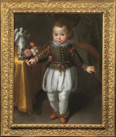 La semplicità della composizione, che ricalca quella dei ritratti ufficiali, è vivacizzata dai numerosi dettagli decorativi dell’abito indossato dal piccolo protagonista della tela presentata, dal mazzo di fiori che tiene in mano e sembra offrire all’osservatore e dalla statuetta raffigurante un arcangelo appoggiata sul tavolo coperto da una tovaglia di un giallo acceso. L’eleganza del disegno e delle cromie utilizzate permettono di accostarlo alla produzione ritrattistica di Tiberio Titi (Firenze 1573 – 1627), figlio e allievo di Santi di Tito, produzione richiestissima alla corte fiorentina dei Medici, come dimostrano i ritratti di Francesco, Carlo ed Eleonora de’ Medici (Firenze, Palazzo Pitti).