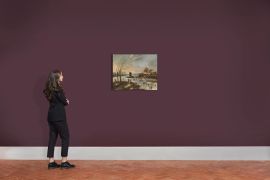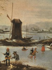 Questa tipologia di paesaggio, dove piccoli gruppi di persone sono ritratte su una distesa ghiacciata che si perde in lontananza, trova un illustre predecessore in Peter Bruegel the Elder (Breda, c. 1525 – Bruxelles, 1569) che pare abbia tratto ispirazione dalla piccola glaciazione che ci fu nei Paesi Bassi intorno al 1560. Più prossimi al dipinto qui offerto sono i paesaggi invernali con pattinatori dell’olandese Hendrick Avercamp (Amsterdam, 1585 – Kampen, 1634) che inserisce nelle sue composizioni una gran varietà di figure sia per la foggia degli abiti che per le attività in cui sono impegnate. Anche nella tela qui offerta, costruita secondo tutte le caratteristiche di questo genere – alto punto di vista, prospettiva atmosferica e alberi repoussoir a introdurre la scena -, animano quello che si direbbe un fiume ghiacciato pattinatori intenti a giocare a kolf, una specie di hockey sul ghiaccio, cacciatori, pescatori e una coppia di amanti che sembra cercare un posto più appartato.