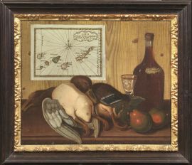 TROMPE L'OEIL WITH MAP, DUCKS, PEARS AND A BOTTLE OF WINE