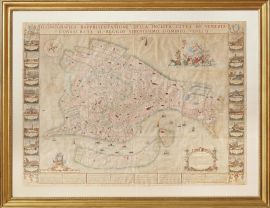 large engraved wall map on 8 sheets joined, with additional panels bearing the running title at head and side panels containing 16 views of prominent buildings (engravings attributed to Francesco Zucchi, after Luca Carlevarij's 'Fabriche e Vedute di Venetia', 1703), coat-of-arms surrounded by putti and military equipment of Francesco Morosini (1619-1694, last of the 'warrior Doges') to lower left, lion of Saint Mark surrounded by marine creatures (after a drawing by Sebastiano Ricci) to upper left, cartouche at bottom right with dedication by Ughi to Doge Alvise III Mocenigo, descriptive text along the lower border, mm 1500x2040