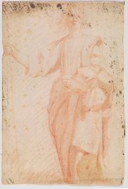 Significativo esempio dello strenuo esercizio disegnativo dei pittori fiorentini seicenteschi sulla resa della figura umana, in questo caso drappeggiata. Se sul verso il delicato segno della matita rossa indugia sul fitto tratteggio parallelo per delineare con più precisione l’andamento delle pieghe della veste, sul recto il pennello intriso di biacca definisce in maniera piuttosto suggestiva le luci sopra il precedente tracciato con la pietra nera. Sia dal punto di vista tecnico che stilistico, troviamo i confronti più stringenti all’interno del catalogo di disegni di Ludovico Cardi detto il Cigoli (Cigoli di San Miniato, 1559 – Roma, 1613) che conta su una cospicua serie di studi per singole figure, poi successivamente “montate” in una composizione. Stupendo il foglio messo in relazione con la tela raffigurante L’imperatore Eraclio trasporta la Santa Croce a Gerusalemme (1594), dove sopra una assai simile carta tinta il pittore ha sperimentato i lumi per la donna inginocchiata a destra (Firenze, GDSU 8965 F) e di grande interesse anche le analogie con gli studi a pennello e biacca riferiti alla tarda attività di Cigoli, come quelli degli apostoli destinati agli affreschi della Cappella Paolina (cfr. Disegni di Lodovico Cigoli (1559 – 1613), catalogo della mostra a cura di M. Chappel, Firenze 1992, pp. 183-186).