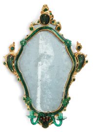 in legno intagliato e dorato con applicazioni in vetro, sagoma di linea modanata in vetro verde interrotta in quattro punti da foglie arricciate rilevate, racchiusa tra la battuta liscia in legno dorato e il profilo esterno anch’esso dorato intagliato a volute arricchite da motivo a nastro pieghettato, al quale si applica la cimasa rocaille inquadrata sui lati da cartelle sagomate, realizzate in vetro verde entro profilatura in legno dorato, due braccetti in vetro di linea mossa con piattello circolare che si dipartono dal centro inferiore, cm 92,5x63
