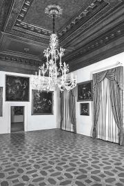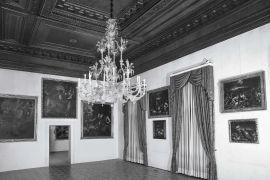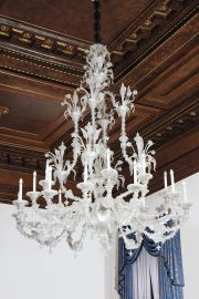 in vetro, fusto centrale di foggia tornita con coronamento a vaso inquadrato da fiori e da foglie rivolte in alto e in basso, dal quale si diparte un unico palco in cui dodici bracci ricurvi si alternano a otto bracci analogamente ricurvi rivolti verso l’alto, per complessive venti luci; dal medesimo palco quattro bracci ricurvi, poggianti su due ordini di bobeches che sostengono decoro con vaso centrale tra fiori e foglie analogo a quello del fusto, si portano in alto a creare al centro superiore il coronamento tornito sormontato da motivo di molteplici elementi a vaso sovrapposti dai quali sporgono fiori e foglie alternativamente rivolte in alto e in basso, alt. cm 285, diam. cm 210