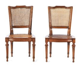 in noce, cartella sagomata profilata da cornice modanata a inquadrare incannucciatura, seduta analogamente incannucciata ricoperta da cuscino in stoffa verde, gambe troncoconiche che si dipartono da dadi angolari ornati da riserva mistilinea, cm 90x52x50