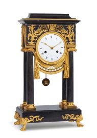 in marmo nero del Belgio e bronzo dorato, base rettangolare ornata sugli angoli da decori vegetali che si portano verso foglia angolare dalla quale si dipartono i piedi leonini; sulla base poggiano quattro colonne con capitelli e basi in bronzo dorato a sostenere al centro il quadrante in smalto bianco con numeri romani e doppio foro di carica firmato Mugnier J.ne, cassa inquadrata in alto da trabeazione centinata impreziosita da fregi dorati vegetali e in basso da drappo, completo di pendolo, cm 50x29x15,5