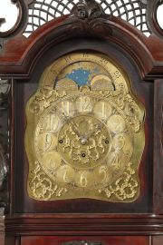 in mogano di forma architettonica, cassa centinata sormontata da cimasa realizzata a giorno con timpano spezzato a volute posto a inquadrare vaso al centro, altri due vasi sui lati; sportello superiore di linea sagomata profilato da volute inquadrato agli angoli da volute scolpite a giorno a mostrare il quadrante in lamina metallica con numeri arabi, tre fori di carica e tre quadranti ausiliari, arricchito da ramages vegetali al centro e agli angoli e sormontato da quadrante con le fasi lunari, corpo con sportello in vetro sul fronte di linea sagomata profilata da volute a mostrare al centro le canne e i pesi, inquadrato agli angoli da colonnine tornite, su base quadrangolare ornata su tre lati da sformellature delle quali quella sul fronte intagliata con maschera leonina dalla quale si dipartono elementi fogliacei e terminante in piedi modanati, cm 280x65x42