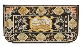 in scagliola di forma rettangolare con angoli anteriori stondati, al centro cartiglio sagomato a inquadrare scena con animali entro ambiente campestre tra girali fogliacei e fiori ai lati, entro ricca bordura a riserve mistilinee con animali entro paesaggi intervallate da girali intrecciati impreziositi da fiori, su base in ferro battuto con gambe ornate all'attacco da crochet di foglie di acanto e terminanti in piedini a mezza sfera, cm 75,5x109,5x56