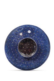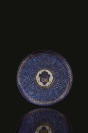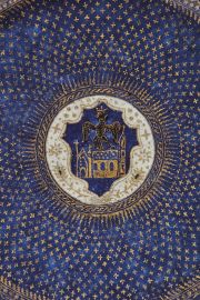 in rame smaltato in blu, bianco e verde con decori in oro, di forma circolare, centrata da stemma araldico; diam. cm 25,2, diam. piede cm 10,4, alt. cm 4,2