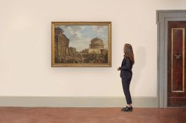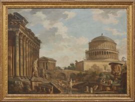 Il dipinto riprende con alcune varianti una composizione paniniana assente nel catalogo di Ferdinando Arisi ma documentata come opera dell'artista piacentino da un’incisione di J.S. Muller, riferita a un dipinto nella collezione di George Lewis Coke. Come indicato da didascalie sul margine della stampa, gli edifici raffigurati sono identificabili con il tempio di Adriano, terminato da Antonino Pio e utilizzato alla fine del Seicento come Dogana di Terra, il tempio di Portuno, allora identificato come della Fortuna Virile, con a destra una restituzione ideale del Mausoleo di Adriano. Completano il “capriccio” la statua dell’Ercole Farnese e il Vaso Borghese.