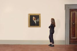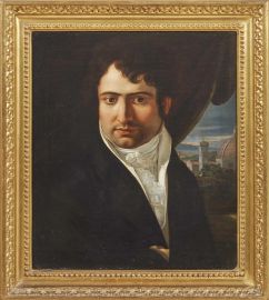 Nel caso del nostro dipinto, l’effigiato è Girolamo Bonaparte, erroneamente indicato su un cartellino collocato sul retro della tela con il nome del figlio, Girolamo Napoleone. Si tratta invece del ritratto dell’ultimo fratello di Napoleone, nato nel 1784 ed esule a Firenze nel 1840 dove si sposa con la marchesa Giustina Pericoli. L’uomo è visto di fronte e osserva lo spettatore con occhi assorti. La sua mano destra è quasi del tutto nascosta nella giacca scura la cui austerità è in contrasto con il candore della camicia e del foulard di pizzo legato intorno al collo. La presenza di Girolamo Bonaparte nella città fiorentina fa supporre che il dipinto risalga a quell’anno, quando Benvenuti, ancora molto attivo, si occupa da tempo anche di ritratti maggiormente accostabili ad accezioni romantiche. In questo caso, tuttavia, egli sceglie un’impostazione neoclassica lasciando un suggestivo spiraglio sulla destra che si apre sulle colline fiorentine, su Santa Maria del Fiore con la facciata ancora in mattoni dominata dalla maestosità della cupola di Brunelleschi e sul campanile di Giotto, tra i più elevati esempi di architettura italiana realizzati tra il Trecento e il Quattrocento.
