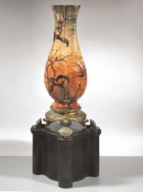 (1) Importante e maestoso vaso in ceramica di forma a balaustro con collo quadrilobato poggiante su base circolare, decoro dipinto a smalti policromi di tralci di magnolia su fondo cremisi-rosato. Il vaso è guarnito in bronzo dorato stilizzato a motivi japonisant con base in legno ebanizzato.