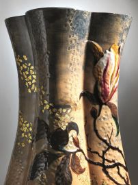 (2) Grande importante vaso polilobato in terracotta, decorato in barbottina con rami, fiori e boccioli di magnolia, su fondo grigio tortora nella parte alta e bruno rosso nella parte inferiore, costellato di pagliette color oro associate ad un effetto di superficie battuta in tutto l'insieme del vaso.