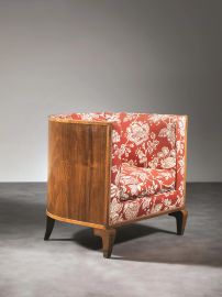 A PAIR OF ARMCHAIRS, INLAID WOOD STRUCTURE, FABRIC UPHOLSTERY