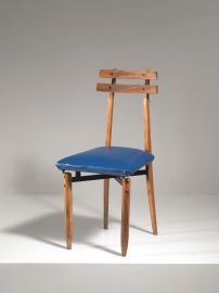 SIX CHAIRS, WOOD AND METAL STRUCTURE, BLUE LEATHERETTE UPHOLSTERY