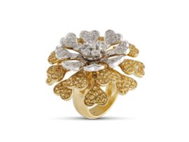 in oro giallo e bianco 18kt, composto da petali mobili a forma di cuore impreziositi da diamanti taglio brillante per ct 1.10 circa e zaffiri gialli per ct 2.30 circa, punzoni 750 e del fabbricante, mis. 14, gr. 36