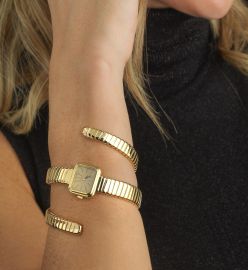 cassa rettangolare in oro giallo 18kt, ghiera a scalino, quadrante champagne con firma "Bulgari", indici neri stampati, movimento a carica manuale Gerald Genta cal 2442, bracciale tubogas a doppio giro, diam. cm 5 circa, punzoni dell'oro, gr. 90. Dim. mm 20x18