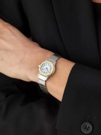 cassa in acciaio, fondello serrato con viti, lunetta in oro giallo 18kt, quadrante bianco, grafica nera, numeri romani stampati, movimento a carica automatica, bracciale in acciaio serrato con viti in oro, chiusura firmata "Cartier", vetro minerale. Diam. mm 25