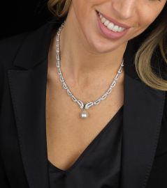 in oro bianco 18kt, diamanti taglio brillante e huit huit per ct 8 circa, perla south sea pendente a forma di goccia di mm 16x12 circa, lungh. cm 43, gr. 37