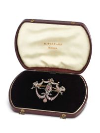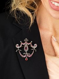 in oro e argento, impreziosita da pietre sintetiche di colore rosso e diamanti taglio vecchio e a rosa per ct 0.50 circa, dim. cm 5x5,5, gr. 13. Corredata di scatola.