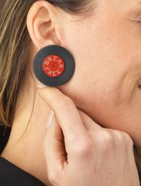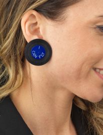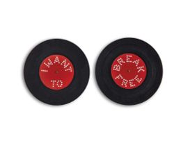 in titanio smaltato e diamanti, a forma di vinili, un paio di colore rosso con la centro la scritta “I Want To Break Free”, il secondo paio di colore blu recante la scritta "I Believe I Can Fly", chiusura a clip con perno in oro 18kt, diam. cm 4, gr. 34 complessivi