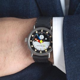 cassa in acciaio brunito, fondello a scatto in acciaio, quadrante bianco e nero, sfere colorate, indici al trizio, datario a ore 3 in rosso, movimento al quarzo con complicazione GMT, cal. ESA 555.412, cinturino in pelle, vetro minerale. Corredato di scatola e garanzia. Diam. mm 36