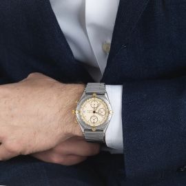 cassa in acciaio, fondello a vite, lunetta girevole in acciaio con cavalieri in oro giallo, quadrante crema, indici al luminova, datario a ore 3, movimento a carica automatica cal. ETA 7750, bracciale rouleaux in acciaio, vetro minerale. Corredato di scatola, garanzia e libretti. Diam. mm 39
