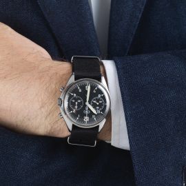 cassa in acciaio di forma asimmetrica, fondello a vite, anse fisse, quadrante nero con simbolo a freccia dell'esercito inglese, indici al trizio, numeri arabi, movimento a carica manuale, cal. Valjoux 7733, bracciale in tela nera tipo Nato, vetro plastica. Diam. mm 39
