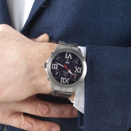 cassa in titanio, fondello a vista, quadrante nero glitterato con 4 fusi orari, indici romani con brillanti, movimento a carica automatica cal. ETA 2671, vetro minerale, bracciale in gomma con chiusura deployant in titanio. Corredato di 4 cinturini colorati in pelle extra originali. Diam. mm 44