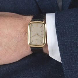 cassa rettangolare in oro giallo 18kt, quadrante grigio, grafica bianca, indici applicati, movimento a carica manuale, cinturino in pelle, vetro plastica. Dim. mm 28x44