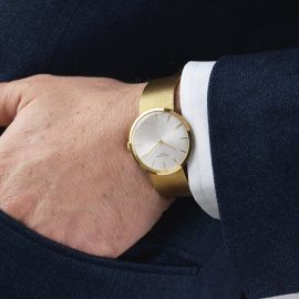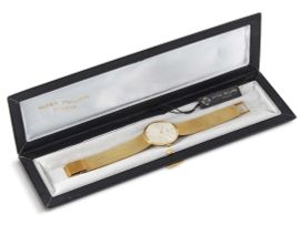 cassa in oro giallo 18kt, fondello a scatto, quadrante argentè, grafica nera, indici applicati, movimento a carica manuale cal. 23-300PM n. 1151625, bracciale integrato alla cassa in oro giallo 18kt, lungh. cm 17 circa, gr. 71 circa, vetro plastica. Corredato di scatola. Diam. mm 33