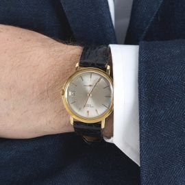 cassa in oro giallo 18kt, fondello a vite, corona marcata Patek Philippe, quadrante argentè, grafica nera, indici applicati, datario a ore 3, movimento a carica automatica cal. 27-460M n. 12314XX, cinturino in pelle, vetro plastica. Diam. mm 35