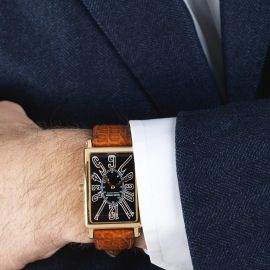 cassa in oro 18kt, quadrante nero, grafica oro, grandi numeri arabi, movimento a carica manuale, cinturino in pelle firmato Roger Dubuis con fibbia firmata in oro 18kt, vetro minerale. Dim. mm 27x38