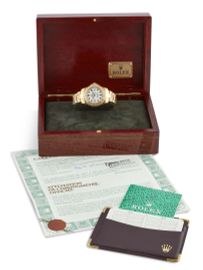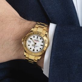 cassa oyster in oro giallo 18kt, fondello a vite, lunetta in oro giallo girevole bidirezionale, quadrante bianco, grafica nera, bicchierini oro, scritta Yacht-master in rosso, datario a ore 3, movimento a carica automatica, cal. 2135, bracciale oyster in oro giallo 18kt n. 78748, finali SEL, vetro minerale. Corredato di garanzia, scatola e libretti. Diam. mm 37