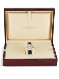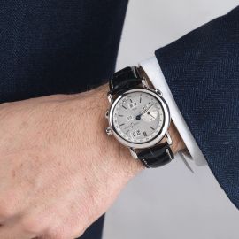 cassa in oro bianco 18kt, fondello con movimento a vista, quadrante argentè, indici oro bianco applicati, finestre del giorno, data e mese, contatore dei secondi a ore 9, freccia della complicazione GMT per secondo fuso orario, movimento a carica automatica, cal. 32.16.0439 con complicazioni calendario perpetuo GMT, vetro minerale, cinturino in pelle con fibbia deployant in oro bianco 18kt. Corredato di scatola e tagliando di revisione del 2005. Diam. mm 38,5