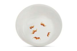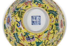 in porcellana smaltata di giallo decorata con fiori di peonia, crisantemo, loto e ibisco intrecciati da rami e fiori, all’interno cinque pipistrelli in rosso ferro; diam. cm 15