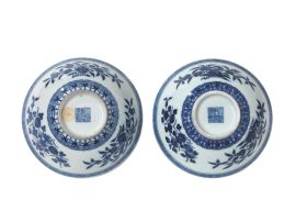 in porcellana bianco-blu decorata con fiori e rami ming style; diam. cm 11,8 (2)