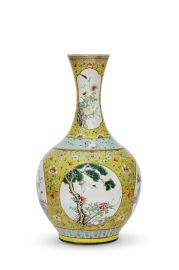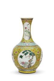 清十九至二十世纪 黄地粉彩开窗松鹤延年赏瓶