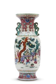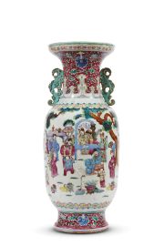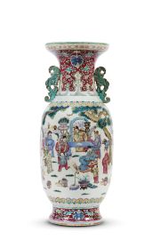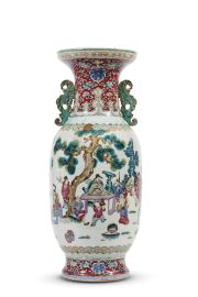 in porcellana decorata con personaggi in un esterno nei toni della “famiglia rosa”, color smaltato con rosso rubino e decoro floreale; alt. cm 61,2