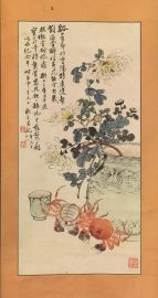 su carta dipinto con granchi, fiori e vasi, poesia e sigilli nella parte destra; cm 31,3x66,2