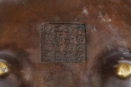 tripode in bronzo brunito con prese circolari, reca marchio Xuande; diam. cm 15,6 alt. cm 10,4